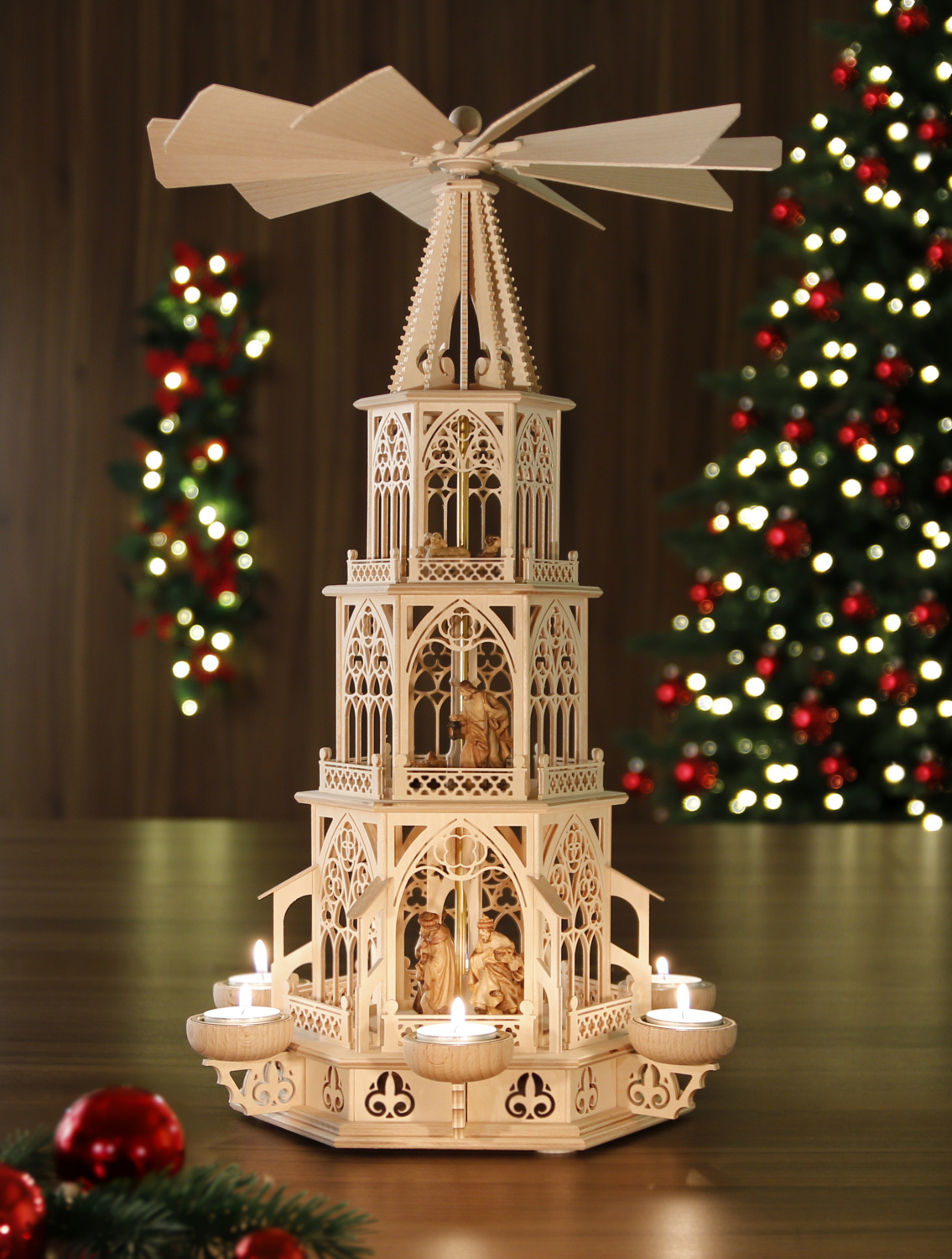 und bestückt aus dem GRÖDNER TAL in Südtirol. In dieser Tilgner-Pyramide haben wir viele Elemente der und filigraner Ausführung dargestellt. Sie reichen vom Spitzbogenfenster mit typischen Drei- und Vierpässen und schmückenden Ornamenten über die sich wiederfindenden Vierpässe die Strebepfeiler und Strebebögen sowie die im Unterbau und bis hin zur typisch schlanken Form der gesamten Pyramide. Neben jedem verzierten "Fenster-Element" gestattet ein stilisiertes offenes Portal weiten Einblick auf die prachtvollen und lieblich dezent bemalten original DOLFI-Skulpturen, geschnitzt von Bildhauermeistern des GRÖDNER TALS (mit Echtheitszertifikat) Die Figuren sind auf der Pyramide fest verleimt. - Heilige Familie im 2. Stock, - Heilige Drei Könige aus dem Morgenland im 1. Stock und - 2 niedliche Schäfchen (d.h. 1 Schäfchen und 1 Widder) im 3. Stock. Diese Pyramide ist mit 6 Teelichthaltern ausgestattet. Technische Daten der Tilgner-Pyramide: Gesamthöhe: ca. 53 cm Etagen: Unterbau + 3 Etagen, 6-eckig Flügelraddurchmesser: ca. 33 cm Teelichthalter: 6 Stück, abnehmbar und somit jederzeit wechselbar. Die aufwendige Verpackung stellt sicher, dass auf dem Transportweg nichts kaputt geht. - sofort lieferbar - Zurück zum Online-Shop | |||||||||||