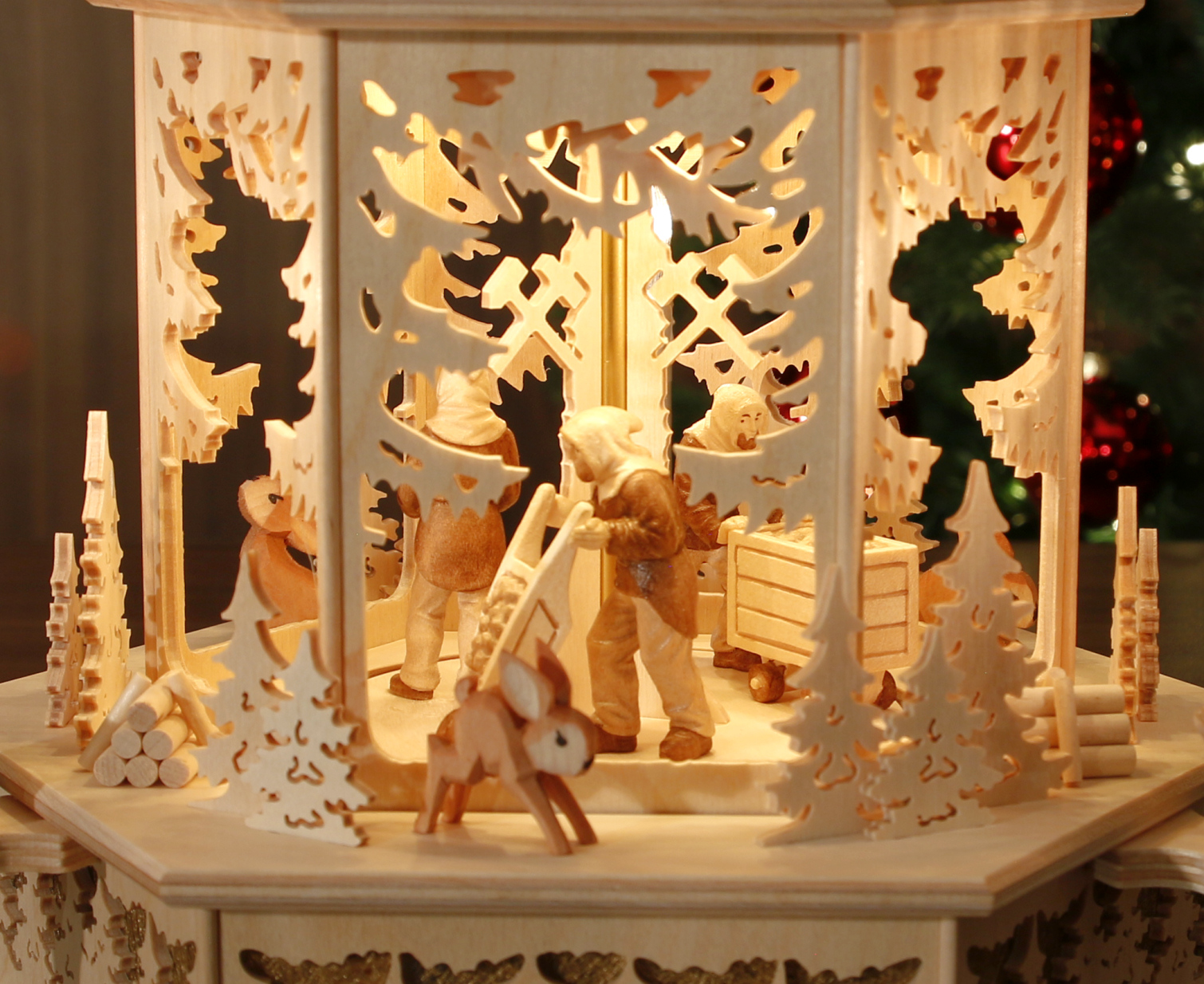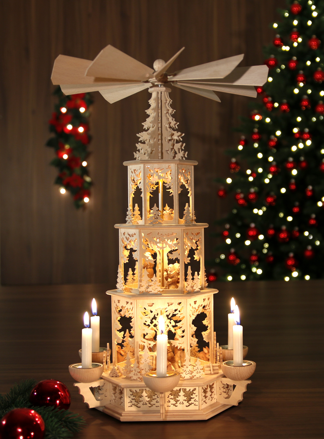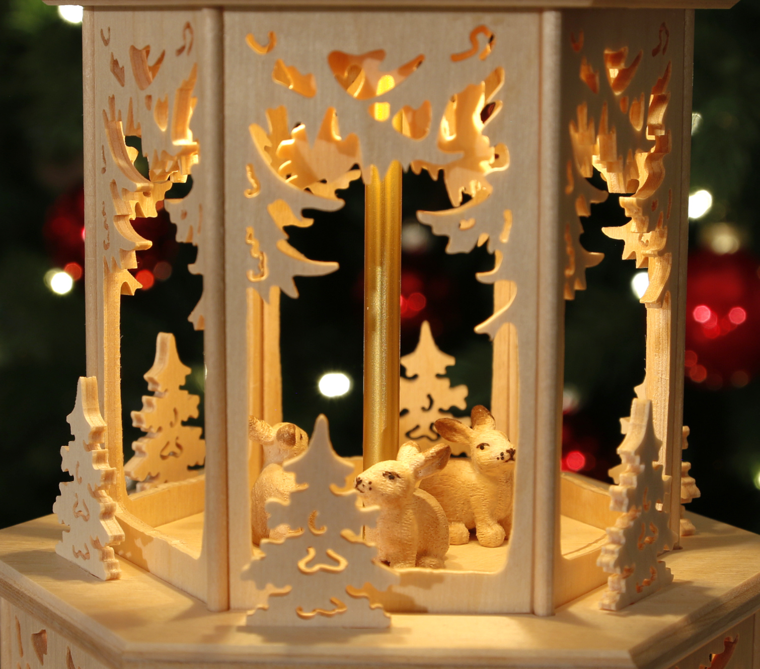 - dem Erzgebirge - und bestückt mit Original Grödner Holzschnitzerei (Fa. C.H.E. Regali / Südtirol) In unserer kleinen Werkstatt in Kurort Oberwiesenthal haben wir für Sie dieses Wald-Modell mit kleinen 3D-Effekten - einen filigranen Traum aus Holz - entwickelt und hergestellt. Diese 3-stöckige, 6-eckige Pyramide Höhe: ca. 53 cm wurde aus vielen Einzelteilen in liebevoller Handarbeit zusammengefügt. Komplettiert mit Grödner Holzschnitzerei (Bergleute in der 1. und 2. Etage), und niedlichen Häschen in der 3. Etage wird diese Pyramide die Advents- und Weihnachtszeit mit besonderer Romantik erfüllen. Die Figuren/Tiere sind auf der Pyramide fest verleimt. Technische Daten: Diese Tilgner-Pyramide verfügt über eine langlebige, energiesparende Warmton-LED-Beleuchtung in allen 3 Etagen. Sie ist mit 6 Teelichthaltern + 6 Kerzenadaptern ausgestattet, so dass die Pyramide durch die Wärme der Lichter angetrieben wird (ohne Motor!) Sind die Kerzen (oder Teelichter) aus, dreht sich die Pyramide nicht, verströmt aber durch ihre warme Beleuchtung eine wohlige Atmosphäre im Raum. Mit Steckernetzteil 12V (Eingang:230V, Ausgang:12V) Flügelraddurchmesser: ca. 33 cm Die aufwendige Verpackung stellt sicher, dass auf dem Transportweg nichts kaputt geht. - sofort lieferbar - Zurück zum Online-Shop | |||||||||