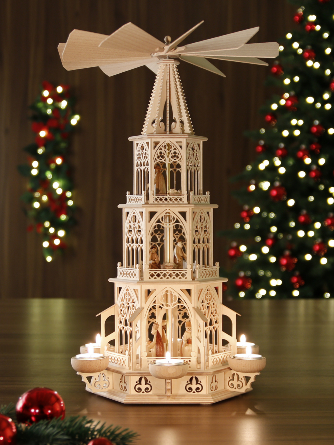 und bestückt aus Kurort Seiffen/Erzgebirge In dieser Tilgner-Pyramide haben wir viele Elemente der und filigraner Ausführung dargestellt. Sie reichen vom Spitzbogenfenster mit typischen Drei- und Vierpässen und schmückenden Ornamenten über die sich wiederfindenden Vierpässe die Strebepfeiler und Strebebögen sowie die im Unterbau und bis hin zur typisch schlanken Form der gesamten Pyramide. Die Figuren sind auf der Pyramide fest verleimt. - Heilige Familie im 2. Stock, - Heilige Drei Könige aus dem Morgenland im 1. Stock und - Schäfer mit Schäfchen im 3. Stock. Diese Pyramide ist mit 6 Teelichthaltern ausgestattet. Technische Daten der Tilgner-Pyramide: Gesamthöhe: ca. 53 cm Etagen: Unterbau + 3 Etagen, 6-eckig Flügelraddurchmesser: ca. 33 cm Teelichthalter: 6 Stück, abnehmbar und somit jederzeit wechselbar. Die aufwendige Verpackung stellt sicher, dass auf dem Transportweg nichts kaputt geht. - sofort lieferbar - Zurück zum Online-Shop | |||||||||