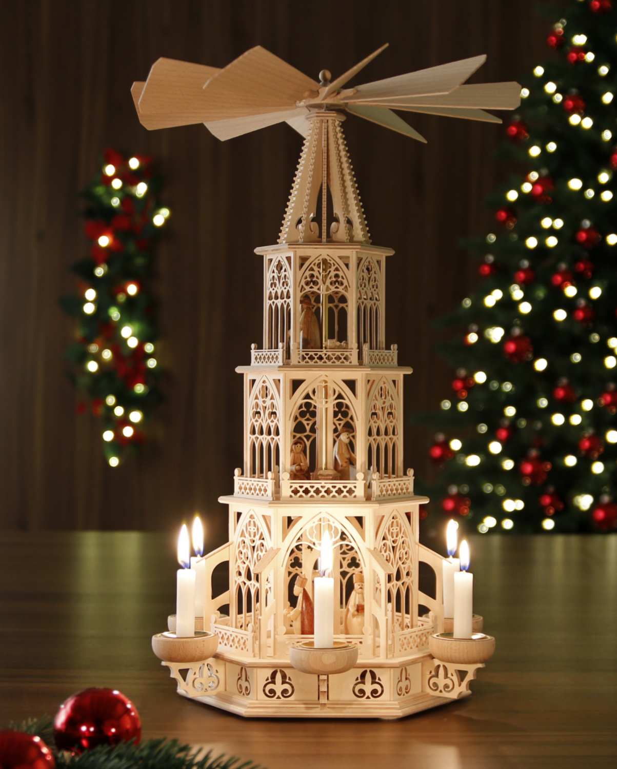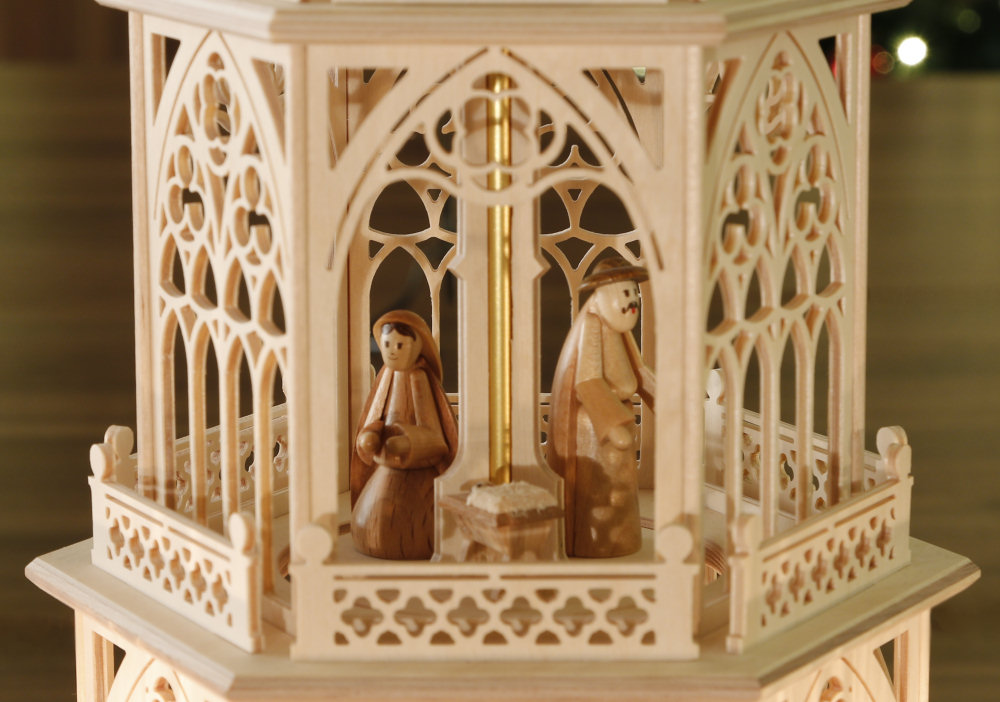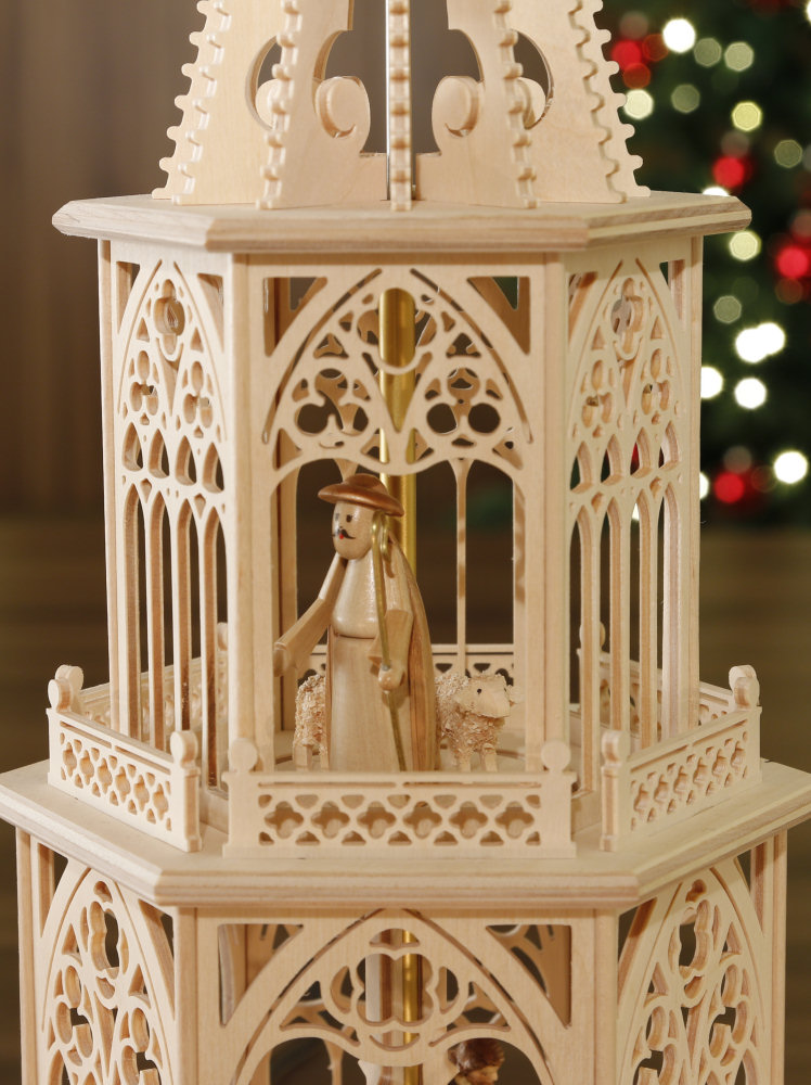 und bestückt aus Kurort Seiffen/Erzgebirge In dieser Tilgner-Pyramide haben wir viele Elemente der und filigraner Ausführung dargestellt. Sie reichen vom Spitzbogenfenster mit typischen Drei- und Vierpässen und schmückenden Ornamenten über die sich wiederfindenden Vierpässe die Strebepfeiler und Strebebögen sowie die im Unterbau und bis hin zur typisch schlanken Form der gesamten Pyramide. Die Figuren sind auf der Pyramide fest verleimt. - Heilige Familie im 2. Stock, - Heilige Drei Könige aus dem Morgenland im 1. Stock und - Schäfer mit Schäfchen im 3. Stock. Diese Pyramide ist mit 6 Teelichthaltern + 6 Adapter für Kerzen ausgestattet. Technische Daten der Tilgner-Pyramide: Gesamthöhe: ca. 53 cm Etagen: Unterbau + 3 Etagen, 6-eckig Flügelraddurchmesser: ca. 33 cm Teelichthalter: 6 Stück + Adapter für Kerzen Die aufwendige Verpackung stellt sicher, dass auf dem Transportweg nichts kaputt geht. - sofort lieferbar - Zurück zum Online-Shop | |||||||||