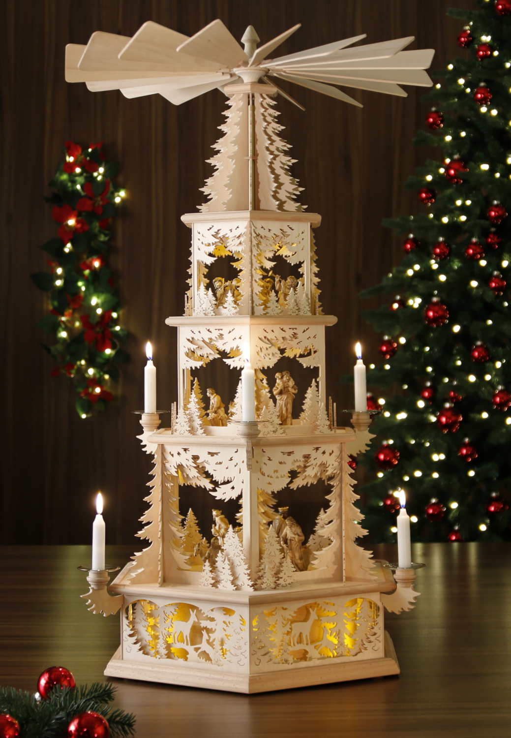 und bestückt mit Krippenfiguren u. Engel der Fa. SALCHER/Grödnertal In unserer Pyramidenwerkstatt Tilgner entwickelten wir für Sie diese Weihnachtspyramide „Waldidyll“ mit einer Höhe von ca. 1,07 m Flügelraddurchmesser: ca. 62cm. Wir haben versucht, die Romantik der Wälder, stilisiert aus naturbelassenem Birkenschichtholz, darzustellen. Bitte betrachten Sie die vielen 3-D-Effekte! Schon die vielen Bäumchen im Außenbereich laden den Betrachter ein, sich das Gesamtkunstwerk, das in liebevoller Handarbeit zusammengefügt wurde, näher anzuschauen. Viele prachtvolle Krippenfiguren und Engel der Fa. SALCHER aus dem Grödnertal ergänzen diese wunderhübsche Pyramide: Christi Geburt, Ochs und Esel und die Heiligen drei Könige drehen sich auf dem Teller im 1. Stock, Hirten, Schäfchen und Ziegen bewegen sich im Innenbereich des 2. Stockes, 4 liebliche Engel musizieren im 3. Stock. Alle Figuren sind auf der Pyramide fest verleimt! Diese Tilgner Weihnachtspyramide verfügt über eine langlebige, energiesparende Warmton-LED-Beleuchtung im Unterbau und in allen 3 Etagen. Angetrieben wird diese Pyramide mittels Kerzen (OHNE MOTOR!). Sind die Kerzen aus, dreht sich diese Pyramide also nicht, verströmt aber durch ihre dezente Innenbeleuchtung, eine wohlige Atmosphäre im Raum. - mit Steckernetzteil 12V (Eingang: 230V, Ausgang: 12V) - Die aufwendige Verpackung stellt sicher, dass auf dem Transportweg nichts kaputt geht. - nicht mehr lieferbar - Zurück zum Online-Shop | ||||||||||