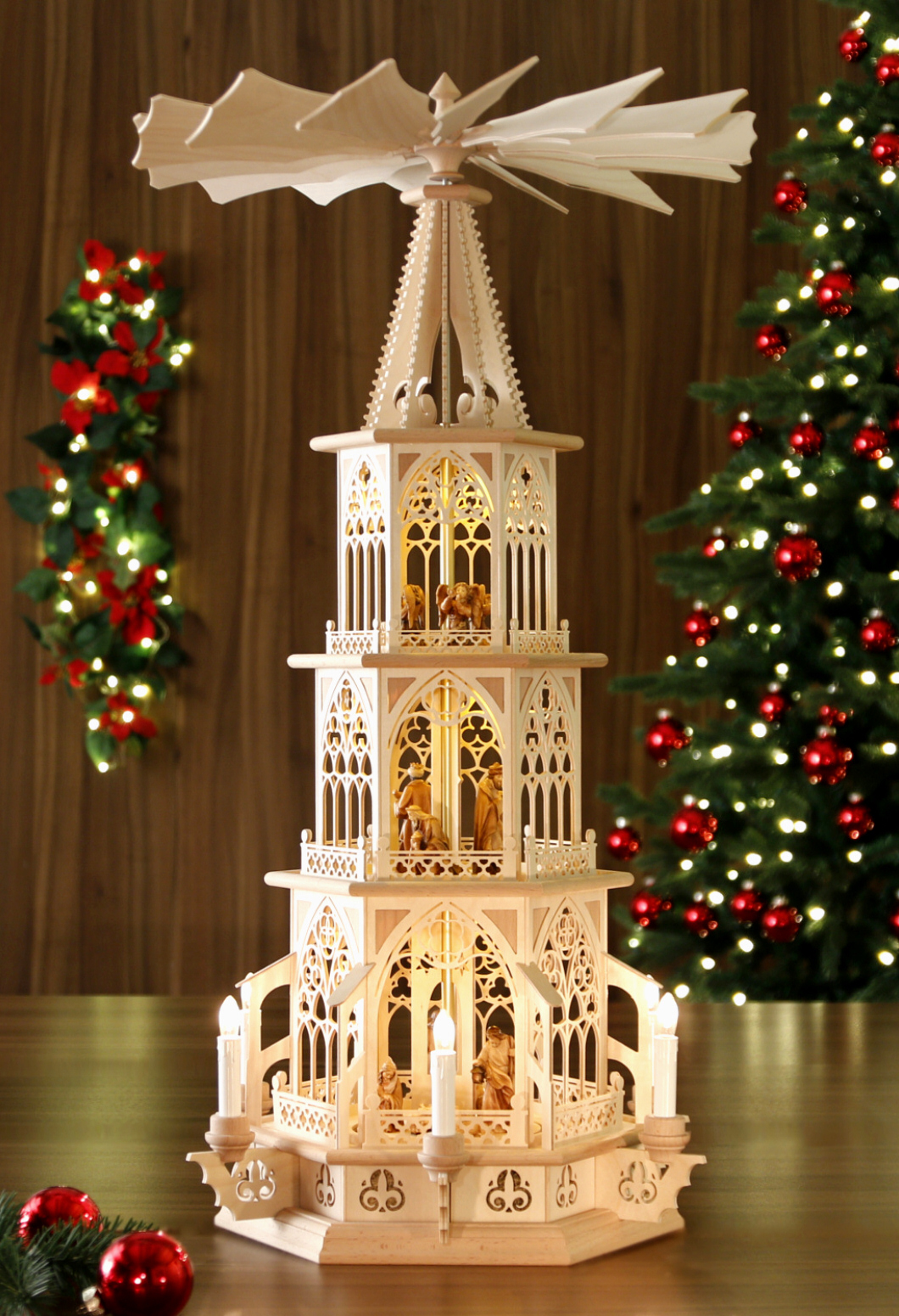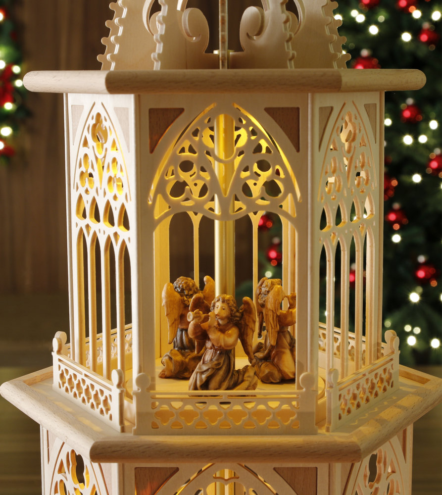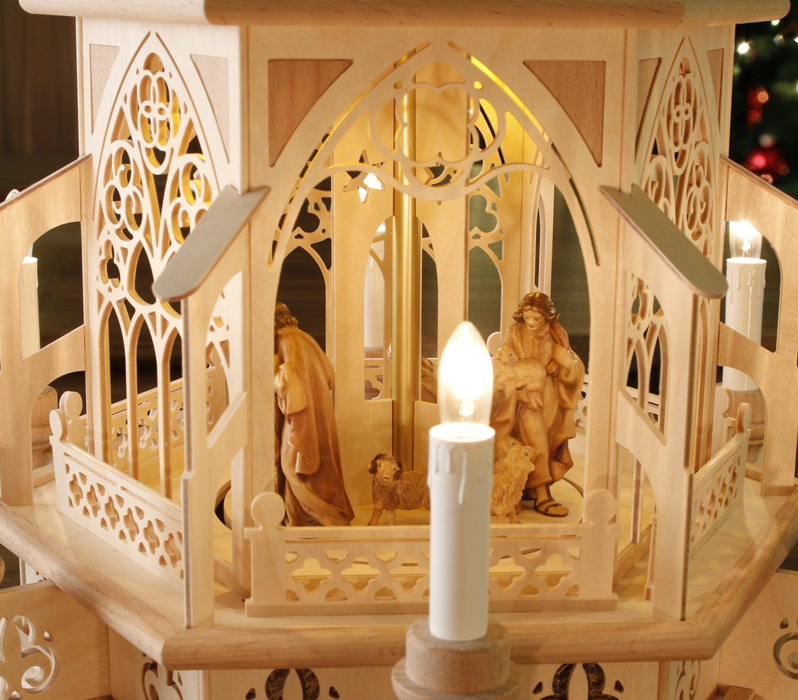 Mitten aus dem Weihnachtsland - dem Erzgebirge und bestückt mit prachtvoll geschnitzten original DOLFI-Krippenfiguren aus dem GRÖDNERTAL. In dieser Tilgner-Pyramide haben wir viele Elemente der Stil-Epoche "Gotik" in Miniatur und filigraner Ausführung dargestellt. Sie reichen vom Spitzbogenfenster mit typischen Drei- und Vierpässen und schmückenden Ornamenten über die sich wiederfindenden Vierpässe in den "Mauerelementen", die Strebepfeiler und Strebebögen sowie die im Unterbau und in der Spitze eingearbeiteten Lilien bis hin zur typisch schlanken Form der gesamten Pyramide. Neben jedem verzierten "Fenster-Element" gestattet ein stilisiertes offenes Portal weiten Einblick auf die prachtvollen und lieblich bemalten Original DOLFI-Krippenfiguren (mit Echtheitszertifikat) Die Figuren sind auf der Pyramide fest verleimt. In allen Pyramidenseitenteilen haben wir, in Anlehnung an eine Intarsienarbeit, farblich abgesetzte Buchenfurnier-Ecken eingearbeitet. Mit ihrer Höhe von 83 cm (Flügelraddurchmesser: ca. 48 cm) hat diese Pyramide die perfekte Größe für jeden Wohnraum. Diese elektrische Tilgner Weihnachtspyramide verströmt durch ihre warme Innenbeleuchtung eine wohlige Atmosphäre im Raum! Sie verfügt über eine sehr langlebige, energiesparende Warmton-LED-Beleuchtung in allen 3 Etagen, hat im Außenbereich 6 elektrische Kerzen und wird mit einem Motor angetrieben. Mit integriertem Netzteil 12V (Eingang: 230V, Ausgang: 12V) Ein Fußschalter ist im Lieferumfang enthalten. Die aufwendige Verpackung stellt sicher, dass auf dem Transportweg nichts kaputt geht. - leider ausverkauft - Zurück zum Online-Shop | |||||||||||