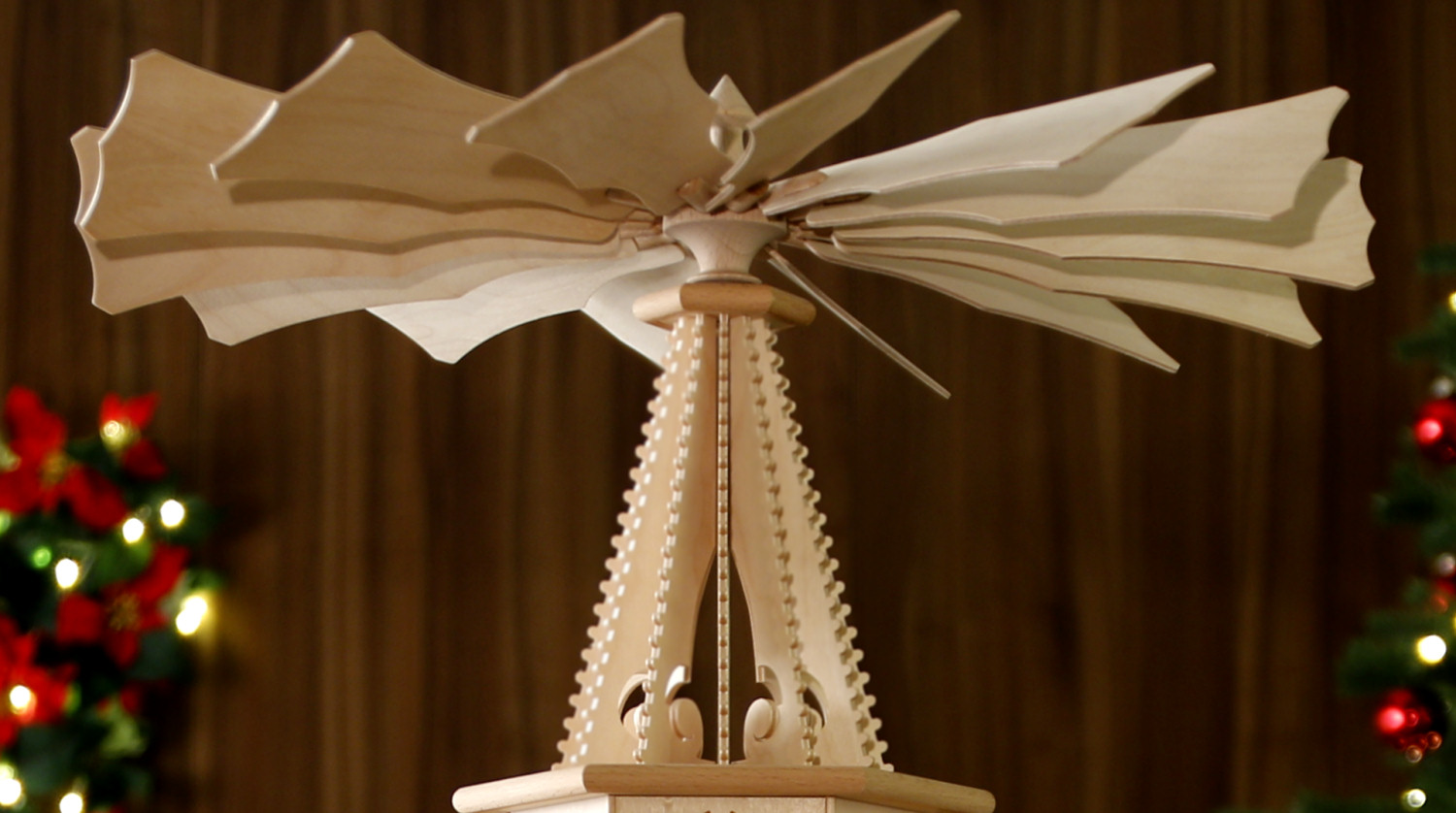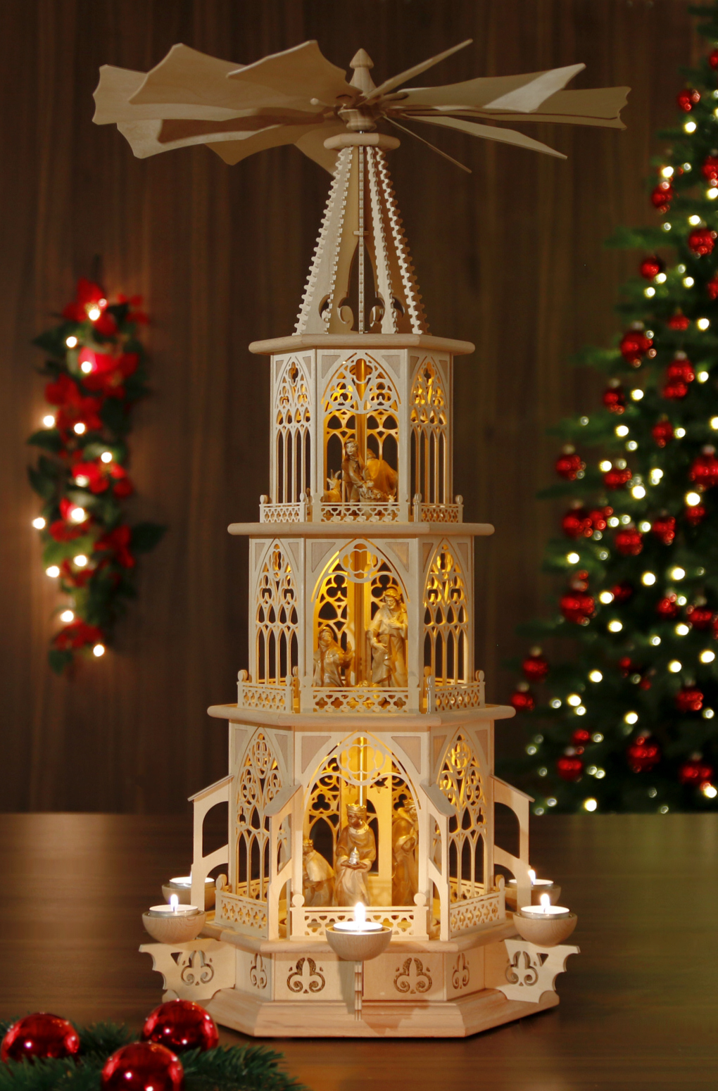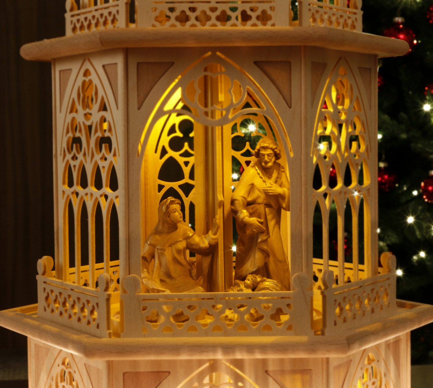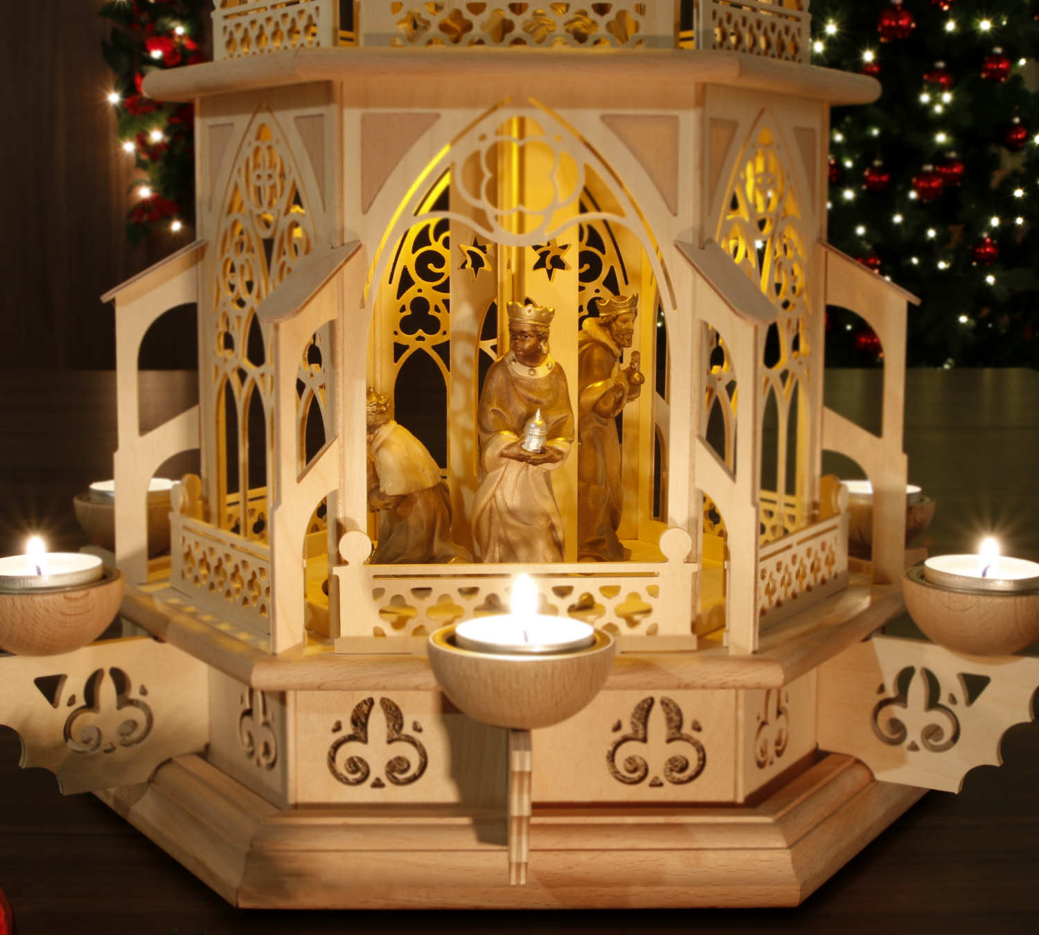 Mitten aus dem Weihnachtsland - dem Erzgebirge und bestückt mit prachtvoll geschnitzten original Salcher-Krippenfiguren aus dem GRÖDNERTAL. In dieser Tilgner-Pyramide haben wir viele Elemente der Stil-Epoche "Gotik" in Miniatur und filigraner Ausführung dargestellt. Sie reichen vom Spitzbogenfenster mit typischen Drei- und Vierpässen und schmückenden Ornamenten über die sich wiederfindenden Vierpässe in den "Mauerelementen", die Strebepfeiler und Strebebögen sowie die im Unterbau und in der Spitze eingearbeiteten Lilien bis hin zur typisch schlanken Form der gesamten Pyramide. Neben jedem verzierten "Fenster-Element" gestattet ein stilisiertes offenes Portal weiten Einblick auf die prachtvoll geschnitzten und lieblich bemalten Original Salcher-Krippenfiguren (mit Echtheitszertifikat) Die Figuren sind auf der Pyramide fest verleimt. In allen Pyramidenseitenteilen haben wir, in Anlehnung an eine Intarsienarbeit, farblich abgesetzte Buchenfurnier-Ecken eingearbeitet. Mit ihrer Höhe von 83 cm (Flügelraddurchmesser: ca. 48 cm) hat diese Pyramide die perfekte Größe für jeden Wohnraum. Diese Tilgner Weihnachtspyramide verfügt über eine langlebige, energiesparende Warmton-LED-Beleuchtung in allen 3 Etagen, hat im Außenbereich 6 Teelichthalter (+ Einsätze für Kerzen), so dass die Pyramide durch diese Lichter/Kerzen angetrieben wird (ohne Motor!). Sind die Teelichter/Kerzen aus, dreht sich diese Pyramide also nicht, verströmt aber durch ihre warme Etagenbeleuchtung eine wohlige Atmosphäre im Raum. mit Steckernetzteil 12V (Eingang: 230 V, Ausgang: 12V) Die aufwendige Verpackung stellt sicher, dass auf dem Transportweg nichts kaputt geht. - leider ausverkauft - Zurück zum Online-Shop | |||||||||||