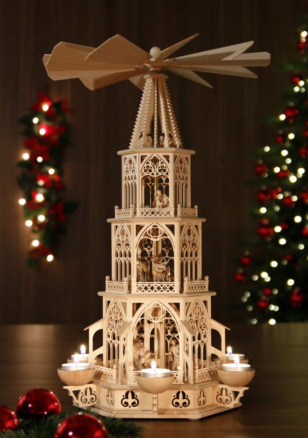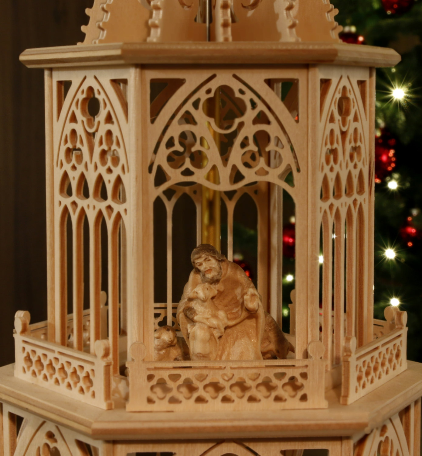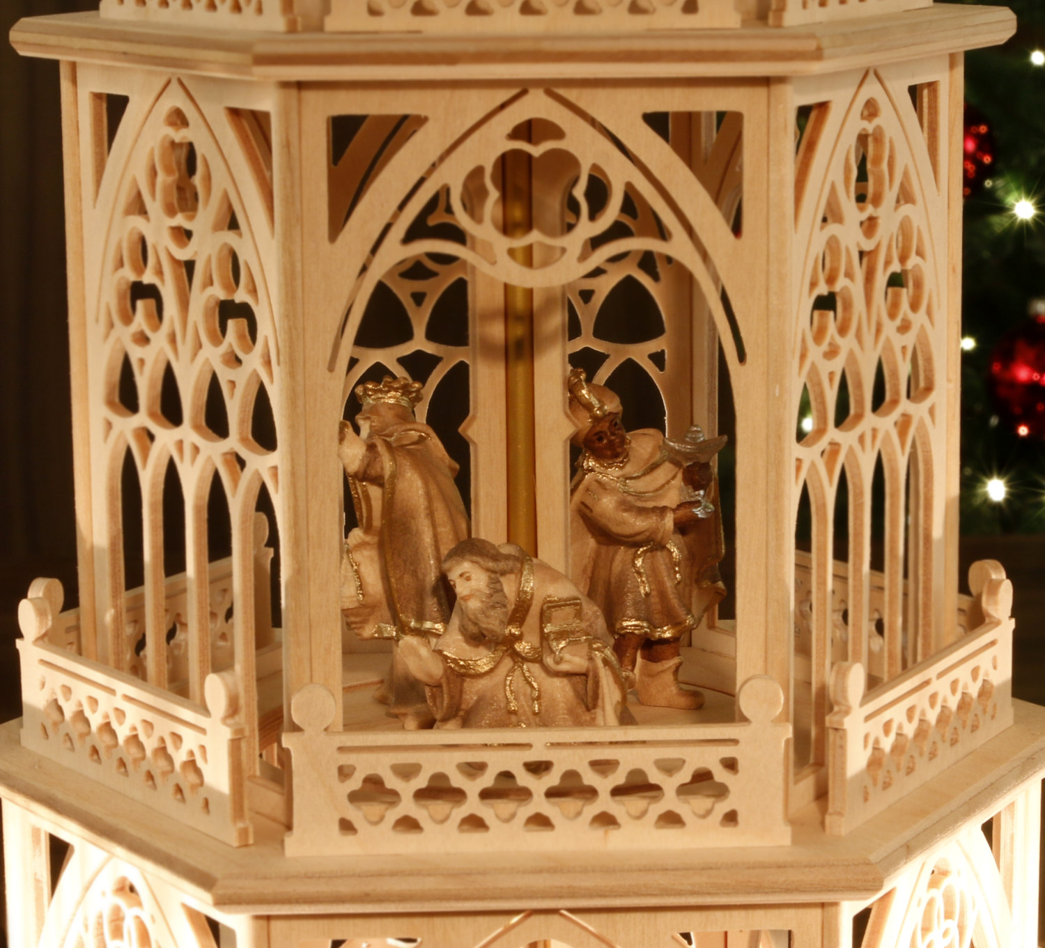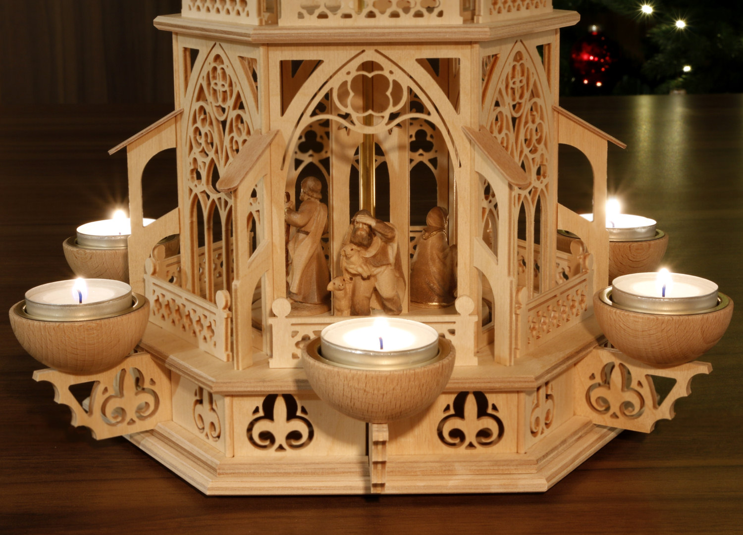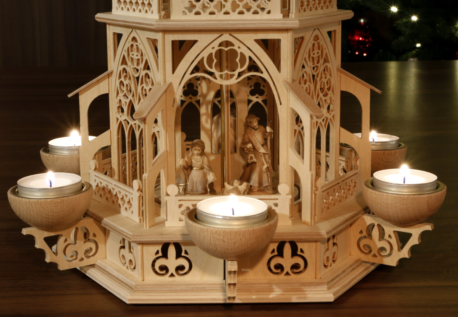 und bestückt aus dem Grödnertal in Südtirol. In dieser Tilgner-Pyramide haben wir viele Elemente der und filigraner Ausführung dargestellt. Sie reichen vom Spitzbogenfenster mit typischen Drei- und Vierpässen und schmückenden Ornamenten über die sich wiederfindenden Vierpässe die Strebepfeiler und Strebebogen sowie die im Unterbau und bis hin zur typisch schlanken Form der gesamten Pyramide. Neben jedem verzierten "Fenster-Element" gestattet ein stilisiertes offenes Portal weiten Einblick auf die prachtvollen und lieblich dezent bemalten echten Salcher-Krippenfiguren, geschnitzt von Bildhauermeistern des Grödnertals (mit Echtheitszertifikat) Die Figuren sind auf der Pyramide fest verleimt. Diese Pyramide ist mit 6 Teelichthaltern ausgestattet. Technische Daten der Tilgner-Pyramide: Gesamthöhe: ca. 53 cm Etagen: Unterbau + 3 Etagen, 6-eckig Flügelraddurchmesser: ca. 33 cm Teelichthalter: 6 Stück, abnehmbar und somit jederzeit wechselbar. Die aufwendige Verpackung stellt sicher, dass auf dem Transportweg nichts kaputt geht. - sofort lieferbar - Zurück zum Online-Shop | |||||||||||
