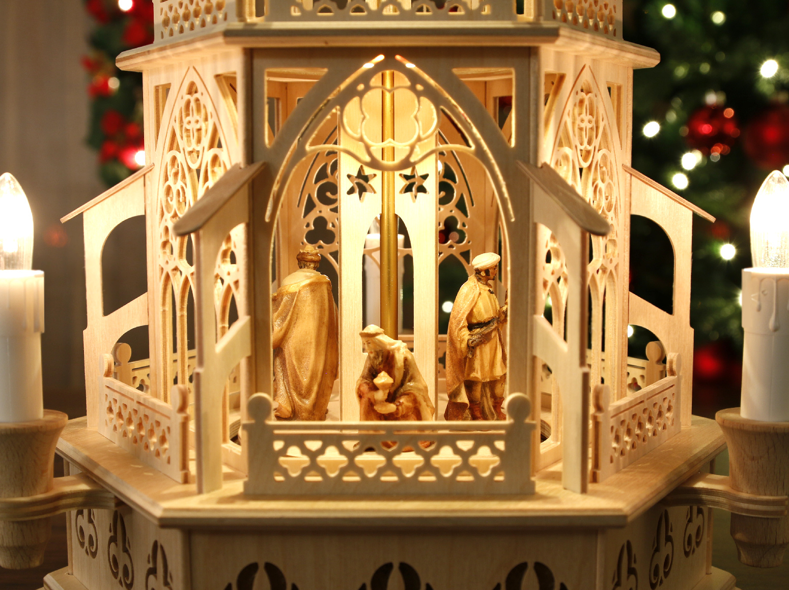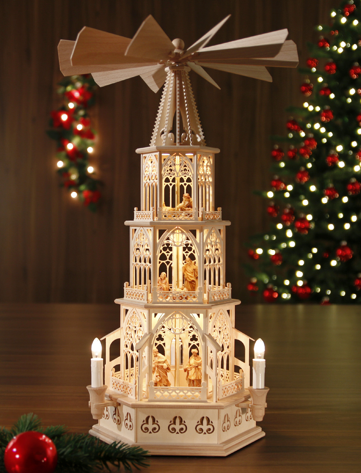 und bestückt aus dem GRÖDNER TAL in Südtirol. In dieser Tilgner-Pyramide haben wir viele Elemente der und filigraner Ausführung dargestellt. Sie reichen vom Spitzbogenfenster mit typischen Drei- und Vierpässen und schmückenden Ornamenten über die sich wiederfindenden Vierpässe die Strebepfeiler und Strebebögen sowie die im Unterbau und bis hin zur typisch schlanken Form der gesamten Pyramide. Neben jedem verzierten "Fenster-Element" gestattet ein stilisiertes offenes Portal weiten Einblick auf die prachtvollen und lieblich dezent bemalten echten DOLFI-Skulpturen, geschnitzt von Bildhauermeistern des GRÖDNER TALS (mit Echtheitszertifikat) Die Figuren sind auf der Pyramide fest verleimt. - Heilige Familie im 2. Stock, - Heilige Drei Könige aus dem Morgenland im 1. Stock und - 1 Schäfer mit Schäfchen und Widder im 3. Stock. Technische Daten der Tilgner-Pyramide: Mit Warmton-LED-Innenbeleuchtung und 3 elektrischen Kerzen (LED Filament Riffelkerzen), einem Motor und Steckernetzteil 12V (Eingang: 230V, Ausgang: 12V) Flügelraddurchmesser: ca. 33 cm Gesamthöhe: ca. 55 cm Pyramide 6-eckig, 3 Etagen Die aufwendige Verpackung stellt sicher, dass auf dem Transportweg nichts kaputt geht. - sofort lieferbar - Zurück zum Online-Shop | ||||||||||